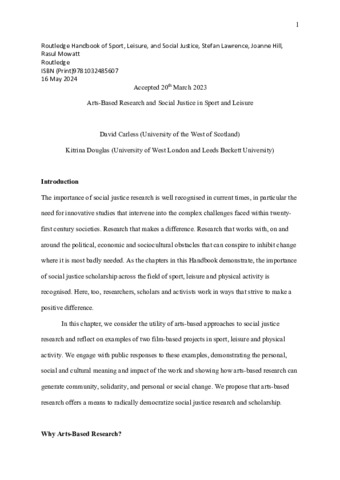 Carless, David and Douglas, Kitrina (2024) Arts-based research and social justice in sport and leisure. In: Routledge Handbook of Sport, Leisure, and Social Justice. Routledge.