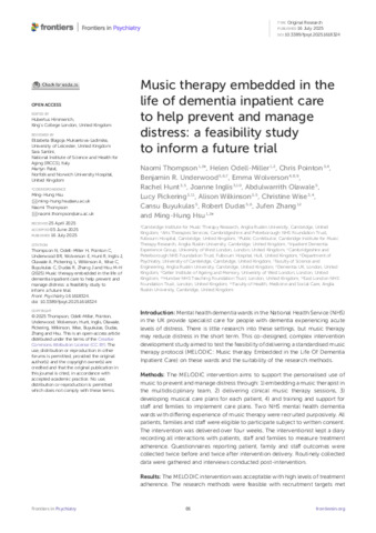 1. Edmans BG, Wolverson E, Dunning R, Slann M, Russell G, Crowther G, et al. Inpatient psychiatric care for patients with dementia at four sites in the United Kingdom. Int J Geriatric Psychiatry. (2022) 37:pp. doi: 10.1002/gps.5658 2. Wolverson E, Dunning R, Crowther G, Russell G, Underwood BR. The characteristics and outcomes of people with dementia in inpatient mental health care: A review. Clin Gerontologist. (2022). doi: 10.1080/07317115.2022.2104145 3. Dementia Australia. Dementia language guidelines (2021). Available online at: https://www.dementia.org.au/sites/default/files/resources/dementia-languageguidelines. pdf (Accessed 1 November 2022). 4. James IA, Reichelt K, Moniz-Cook E, Lee K. Challenging behaviour in dementia care: A novel framework for translating knowledge to practice. Cogn Behav Therapist. (2020) 13:e4323. doi: 10.1017/S1754470X20000434 5. Mental health act 2007. (2007). Available online at: https://www.legislation.gov. uk/ukpga/2007/12/data.pdf (Accessed September 1, 2020). 6. Wolverson EL, Dening KH, Dunning R, Crowther G, Russell G, Underwood BR. Family experiences of inpatient mental health care for people with dementia. Front Psychiatry. (2023) 14:1093894. doi: 10.3389/fpsyt.2023.1093894 7. Wolverson E, Appleyard S, Stirland S, Gower Z. The palliative care symptoms of people with dementia on admission to a mental health ward. Int J Geriatric Psychiatry. (2023) 38. doi: 10.1002/gps.5995 8. Thompson N, Hunt R, Odell-Miller H, Olawale A, Pickering L, Pointon C, et al. Experiences and management of distress and the use of music, including music therapy, on NHS inpatient mental health dementia wards: A qualitative study. Int J Geriatric Psychiatry. (2025) 40. doi: 10.1002/gps.70091 9. Nørgaard A, Jensen-Dahm C, Wimberley T, Svendsen J, Ishtiak-Ahmed K, Laursen T, et al. Effect of antipsychotics on mortality risk in patients with dementia with and without comorbidities. J Am Geriatrics Soc. (2022) 70:1–11. doi: 10.1111/ jgs.17623 10. Leme DEC, Mathias K, Mofina A, Liperoti R, Betini GS, Hirdes JP. A longitudinal treatment effect analysis of antipsychotics on behavior of residents in long-term care. J Am Med Directors Assoc. (2024) 25. doi: 10.1016/j.jamda.2024.105255 11. Mok PLH, Carr M, Guthrie B, Morales D, Sheikh A, Elliott R, et al. Multiple adverse outcomes associated with antipsychotic use in people with dementia: population based matched cohort study. BMJ. (2024) p. doi: 10.1136/bmj-2023-076268 12. National Institute for Health and Care Excellence. Dementia. In: , vol. 184. Quality standard (2019). p. 39. Available at: https://www.nice.org.uk/guidance/qs184/ resources/dementia-pdf-75545721373381 (Accessed June 1, 2019). 13. World Health Organisation. A blueprint for dementia research. (2022). Available online at: https://www.who.int/publications/i/item/9789240058248 (Accessed 6 November 2024). 14. Crowther G, Dunning R, Russell G, Wolverson E, Underwood BR. Dementia inpatient units in psychiatric hospitals: research priority setting. BJPsych Bull. (2024), 1– 7. https://www.cambridge.org/core/product/identifier/S2056469424000421/type/ journal_article. 15. Thompson N, Hsu MH, Odell-Miller H, Underwood BR, Wolverson E. Characteristics, outcomes, facilitators and barriers for psychosocial interventions on inpatient mental health dementia wards: a systematic review. BMC Geriatrics. (2024) 24. doi: 10.1186/s12877-024-04965-8 16. Thompson N, Odell-Miller H, Underwood BR, Wolverson E, Hsu M-H. How and why music therapy reduces distress and improves well-being in advanced dementia care: a realist review. Nat Ment Health. (2024) 2:1532–42. https://www.nature.com/ articles/s44220-024-00342-x. 17. Melhuish R. Group music therapy on a dementia assessment ward: an approach to evaluation. Br J Music Ther. (2013) 27:pp. doi: 10.1177/135945751302700103 18. Gold K. Butdoes itdoany good?Measuring the impactofmusic therapyonpeople with advanced dementia: (Innovative practice). DEMENTIA-INTERNATIONAL J OF Soc Res AND Pract. (2014) 13:258–64. doi: 10.1177/1471301213494512 19. Thompson N, Iyemere K, Underwood BR, Odell-Miller H. Investigating the impact of music therapy on two in-patient psychiatric wards for people living with dementia: retrospective observational study. BJPsych Open. (2023) 9:e42. https://www. cambridge.org/core/product/identifier/S2056472423000200/type/journal_article. 20. Ray KD, Gotell E. The use of music and music therapy in ameliorating depression symptoms and improving well-being in nursing home residents with dementia. Front IN Med. (2018) 5:287. doi: 10.3389/fmed.2018.00287 21. Gold C, Eickholt J, Assmus J, Stige B, Wake J, Baker F, et al. Music Interventions for Dementia and Depression in ELderly care (MIDDEL): Protocol and statistical analysis plan for a multinational cluster-randomised trial. BMJ Open. (2019) 9:pp. https://bmjopen.bmj.com/content/bmjopen/9/3/e023436.full.pdf. 22. Odell-Miller H, Blauth L, Bloska J, Bukowska A, Clark I, Crabtree S, et al. The HOMESIDE music intervention: A training protocol for family carers of people living with dementia. Eur J Invest Health Psychol Educ. (2022) 12:1812–32. https://www.mdpi. com/2254-9625/12/12/127. 23. Thompson N, Odell-Miller H. audit of music therapy in acute National Health Service (NHS) settings for people with dementia in the UK and adaptations made due to COVID-19. Approaches: Interdiscip J Music Ther. (2022) 16(1). doi: 10.56883/ aijmt.2024.70 24. Baker FA, Pak Soo V, Bloska J, Blauth L, Bukowska A, Flynn L, et al. Home-based family caregiver-delivered music and reading interventions for people living with dementia (HOMESIDE trial): an international randomised controlled trial. eClinicalMedicine. (2023) 65. doi: 10.1016/j.eclinm.2023.102224 25. Ridder HM, Krøier JK, Anderson-Ingstrup J, McDermott O. Person-attuned musical interactions (PAMI) in dementia care. Complex intervention research for constructing a training manual. Front Med. (2023) 10:1160588. doi: 10.3389/ fmed.2023.11605