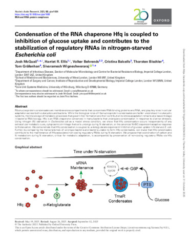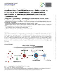 Condensation of the RNA chaperone Hfq is coupled to inhibition of glucose uptake and contributes to the stabilization of regulatory RNAs in nitrogen-starved Escherichia coli.