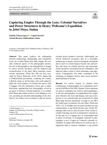 This paper explores the relationship between archaeology, photography, and colonialism at the site of Jebel Moya (Site 100), Sudan. We consider technical aspects of the photographic archive, the role of photographers, the manipulation of images to convey specific narratives, and the dispersal and reclassification of the Jebel Moya materials across various institutions. When Site 100 was first excavated by Henry Wellcome (1911–1914), Sudan had a Condominium government, rendering the country a British colony in all but name. Our work acknowledges the racial legacies of colonial rule and as such it engages with the community whose past is under discussion, emphasizing how photography served as an agent of Western colonial authority. It re-situates Jebel Moya and related archives in the Sudanese context, providing an enriched understanding of the site’s history, the workers who excavated it, and the various colonial power dynamics involved. Additionally, our current fieldwork recognizes that as a discipline, archaeology is deeply rooted in European colonialism and as such we extend inquiry beyond sites and artifacts and focus on colonial practices and representational encounters, pronounced power imbalances, and imperial values rooted in white dominance and superiority. Consequently, this study contributes to the reframing of Sudanese history and a more inclusive understanding of the past.</jats:p>