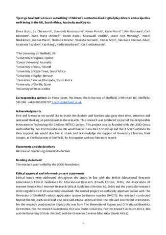 Scott, Fiona, Chesworth, Liz, Kontovourki, Stavroula, Murcia, Karen, Murris, Karin, Balnaves, Kim, Bannister, Cath, Christofi, Anna Maria, Kuria, Daniel, Maditsi, Kwakwadi, Menning, Soern Finn, Neokleous, Theoni, Peers, Joanne, Roscoe, Shabana, Samuels, Vanessa, Scott, Carol, Caetano-Silva, Giovanna, Tsoukka, Anastasia, Wang, Yao, Woodward, Nadia and Trzebiatowski, Cat (2025) ‘I just go headbutt a tree or something’: Children’s contextualised digital play drivers and subjective well-being in the UK, South Africa, Australia and Cyprus. New Media and Society. ISSN 1461-4448 (In Press)