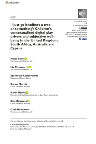 Scott, Fiona, Chesworth, Liz, Kontovourki, Stavroula, Murcia, Karen, Murris, Karin, Balnaves, Kim, Bannister, Cath, Christofi, Anna Maria, Kuria, Daniel, Maditsi, Kwakwadi, Menning, Soern Finn, Neokleous, Theoni, Peers, Joanne, Roscoe, Shabana, Samuels, Vanessa, Scott, Carol, Caetano-Silva, Giovanna, Tsoukka, Anastasia, Wang, Yao, Woodward, Nadia and Trzebiatowski, Cat (2025) ‘I just go headbutt a tree or something’: Children’s contextualised digital play drivers and subjective well-being in the UK, South Africa, Australia and Cyprus. New Media and Society. ISSN 1461-4448