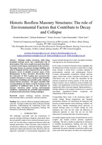 This paper focuses on masonry heritage buildings and ruins in England and has stemmed from an extensive literature review to identify recurrent causes of the disintegration of these structures. Researchers from the University of West London have processed the available literature to create a database that identifies taxonomies of buildings and scientific paths relating to ruinous historic structures. The paper concludes with recommendations for future research, focusing on the acquisition of additional data on the behaviour of masonry structures under varying environmental conditions, emphasising the potential implementation of advanced non-destructive testing techniques.