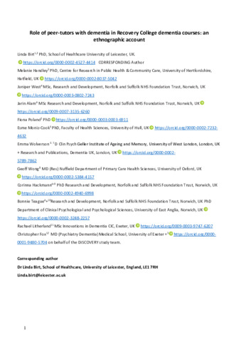 Role of peer-tutors with dementia in Recovery College dementia courses_WolversonE_AM_PDFA.pdf - Accepted Version Restricted to Repository staff only Download (709kB) | Request a copy |