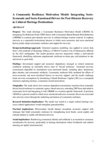 Purpose: This study develops a Community Resilience Motivation Model (CRMM) by integrating Tri-Reference Point (TRP) theory with Community-Based Disaster Risk Reduction (CBDRR) to examine post-disaster recovery in cultural heritage tourism contexts. It explains recovery as a sequential motivational process in which socio-economic and socio-emotional factors jointly shape community resilience and support for recovery